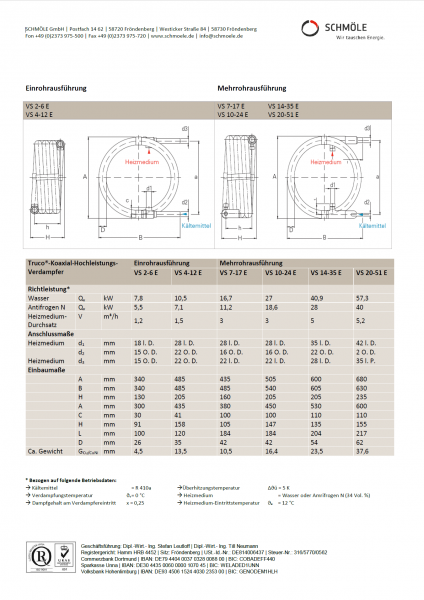 Schmöle coaxial refrigerant evaporator heat exchanger are used for evaporating refrigerants and are suitable for evaporating refrigerants with heating media such as circuit water, ground water and heat transfer media with glycol additives.